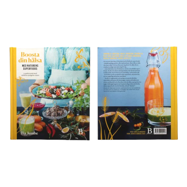 Boosta Din Hälsa Med Naturens Superfood. En fin bok som är vackert illustrerad och innehåller 51 recept kombinerat med information om näring, råvaror att använda, samt förklaringar varför det är bra.
